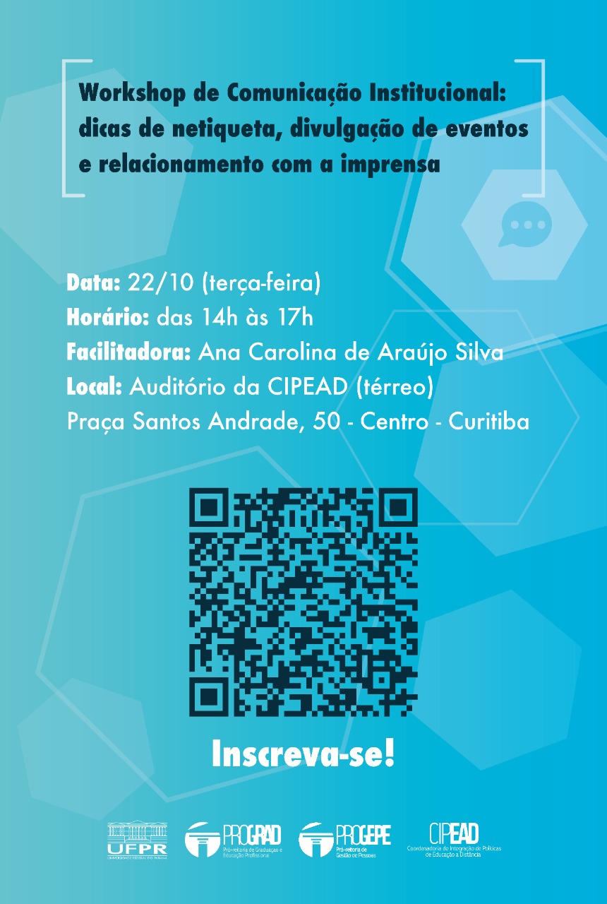 O Cipead convida servidores técnico-administrativos, servidores  docentes e alunos para o workshop de Comunicação Institucional a ser ministrado pela professora e coordenadora do curso de mesmo nome na UFPR, Ana Carolina de Araújo Silva. A oficina abordará questões de netiqueta, relacionamento com a imprensa e diversos outros assuntos. Para se inscrever: https://bit.ly/32orTHc ou acesse o QR Code da imagem!