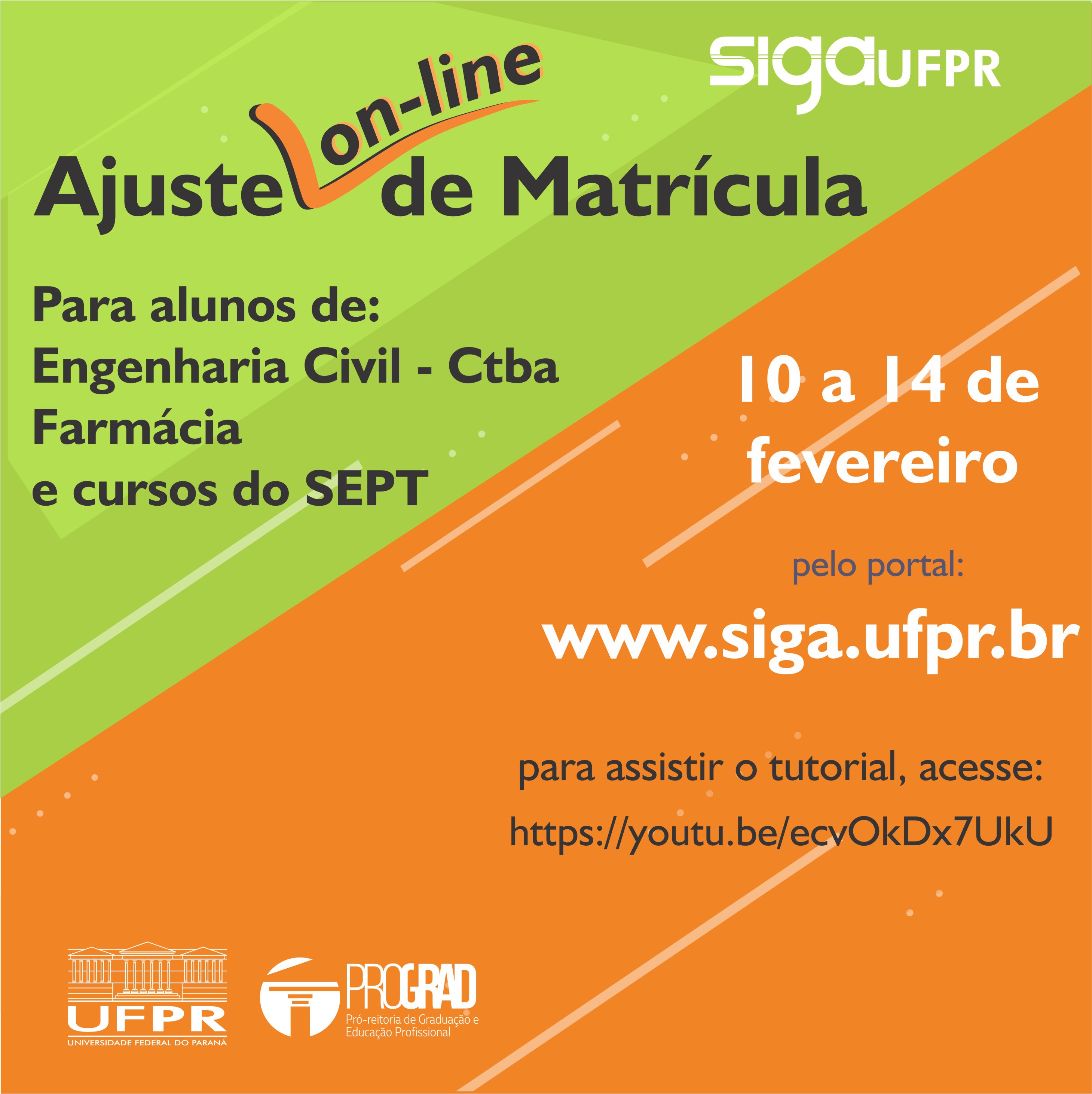 Além da solicitação de matrícula pelo novo Sistema de Gestão Acadêmica – SIGA, os alunos do SEPT, Engenhria Civil de Curitiba e Farmácia podem realizar o ajuste on-line de matrícula. Essa é outra novidade na utilização do SIGA Graduação; enquanto os demais alunos ainda farão o ajuste de matrícula diretamente na coordenação do curso, presencialmente, os alunos do projeto-piloto poderão fazer tudo diretamente no novo portal, sem precisar se deslocar até a secretaria do curso.