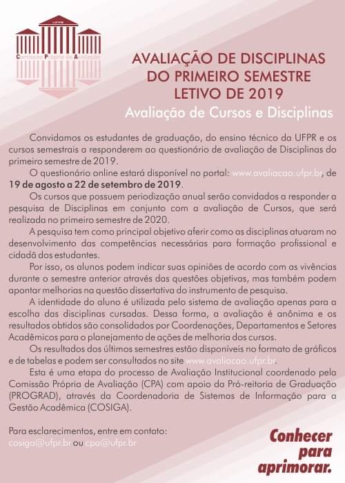 Todos os estudantes da UFPR tem a oportunidade de avaliarem as disciplinas cursadas no semestre anterior. Essa pesquisa é realizada pela Comissão Própria de Avaliação – CPA/UFPR e tem como principal objetivo aferir como as disciplinas apoiaram o desenvolvimento das competências necessárias para formação profissional e cidadã dos estudantes.
