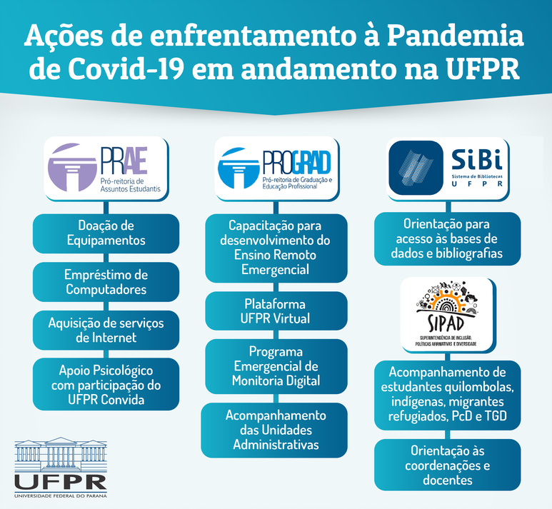 A definição do Ensino Remoto Emergencial se associa às outras ações da UFPR tem adotado de enfrentamento à pandemia na área acadêmica, como o programa de inclusão digital; o treinamento para docentes e a disponibilização de plataformas digitais; e a promoção da saúde mental durante a pandemia.