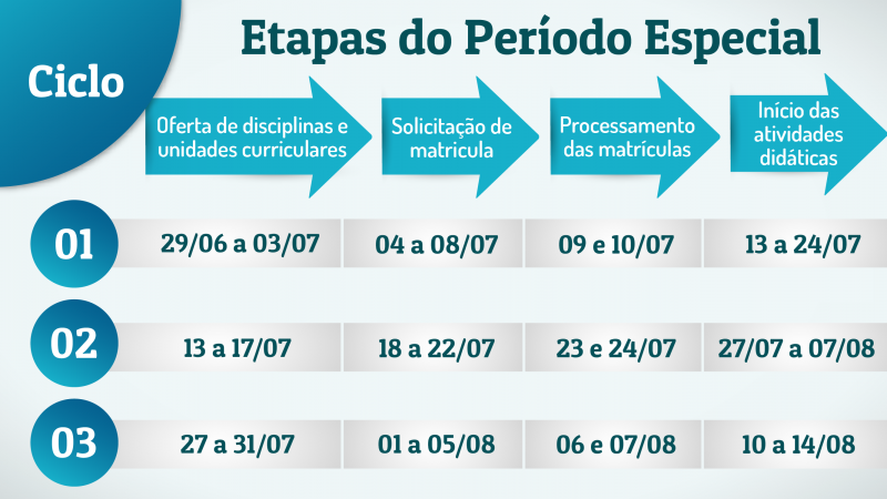 Estes prazos poderão ser prorrogados em razão das medidas de enfrentamento da pandemia. O início das disciplinas se dará a partir de 13 de julho. As disciplinas de estágio obrigatório e de trabalho de conclusão de curso poderão ser concluídas após o período especial, de acordo com a necessidade dos estudantes.