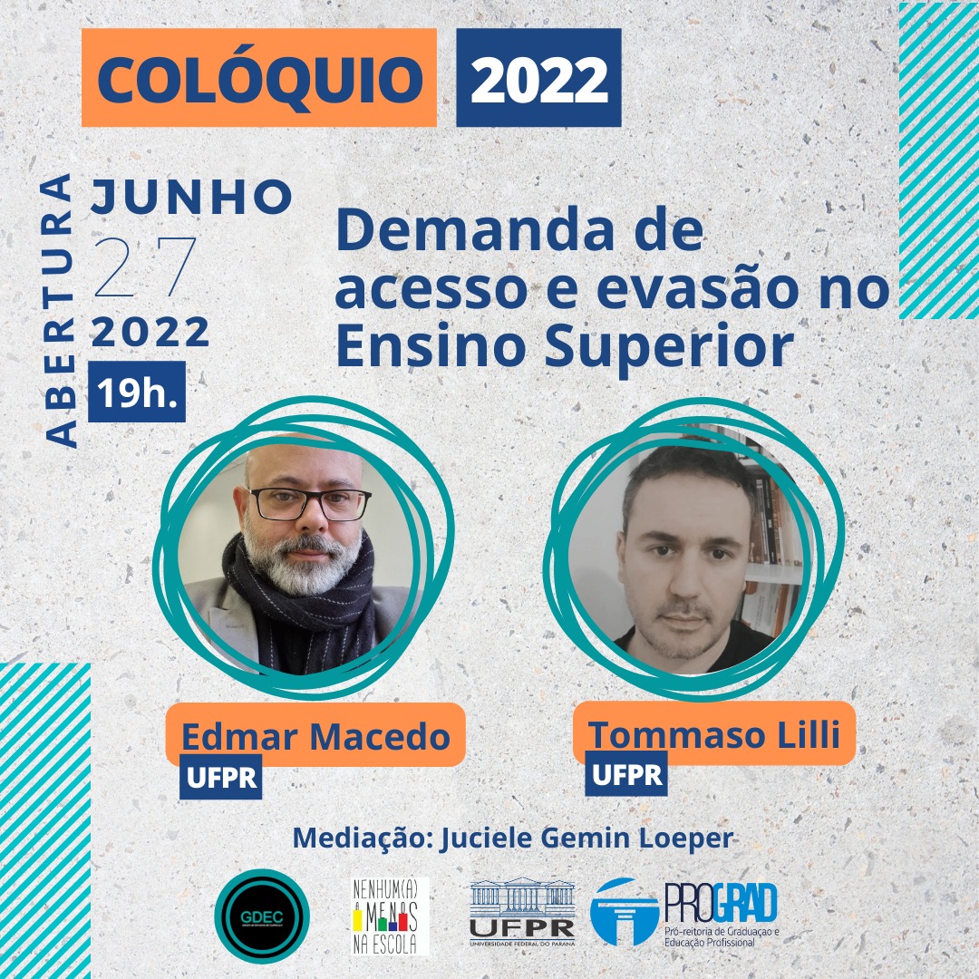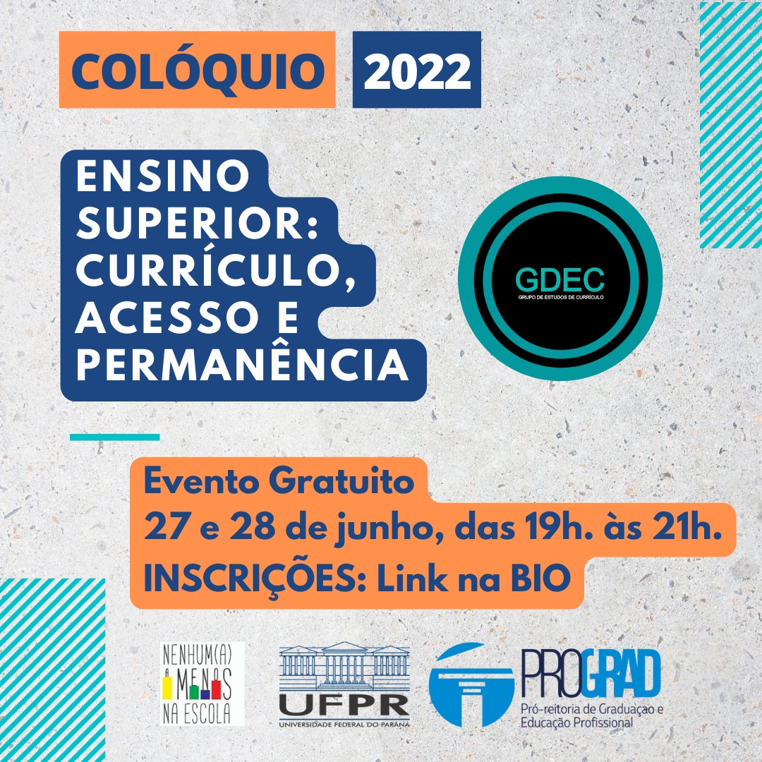 O Colóquio 2022 – GDEC (Grupo de Estudos e Currículo) em parceria com o projeto de extensão Nenhum(a) Menos da Escola e com a PROGRAD (Pró-reitoria de Graduação e Ensino Superior) vai promover uma roda de conversa abordando o tema “Ensino Superior: currículo, acesso e permanência”. O evento é gratuito e será transmito online via Facebook, nos dias 27 e 28 de junho, das 19h às 21h. Mais informações e a programação completa podem ser conferida nas imagens abaixo. As inscrições podem ser feitas através do link.