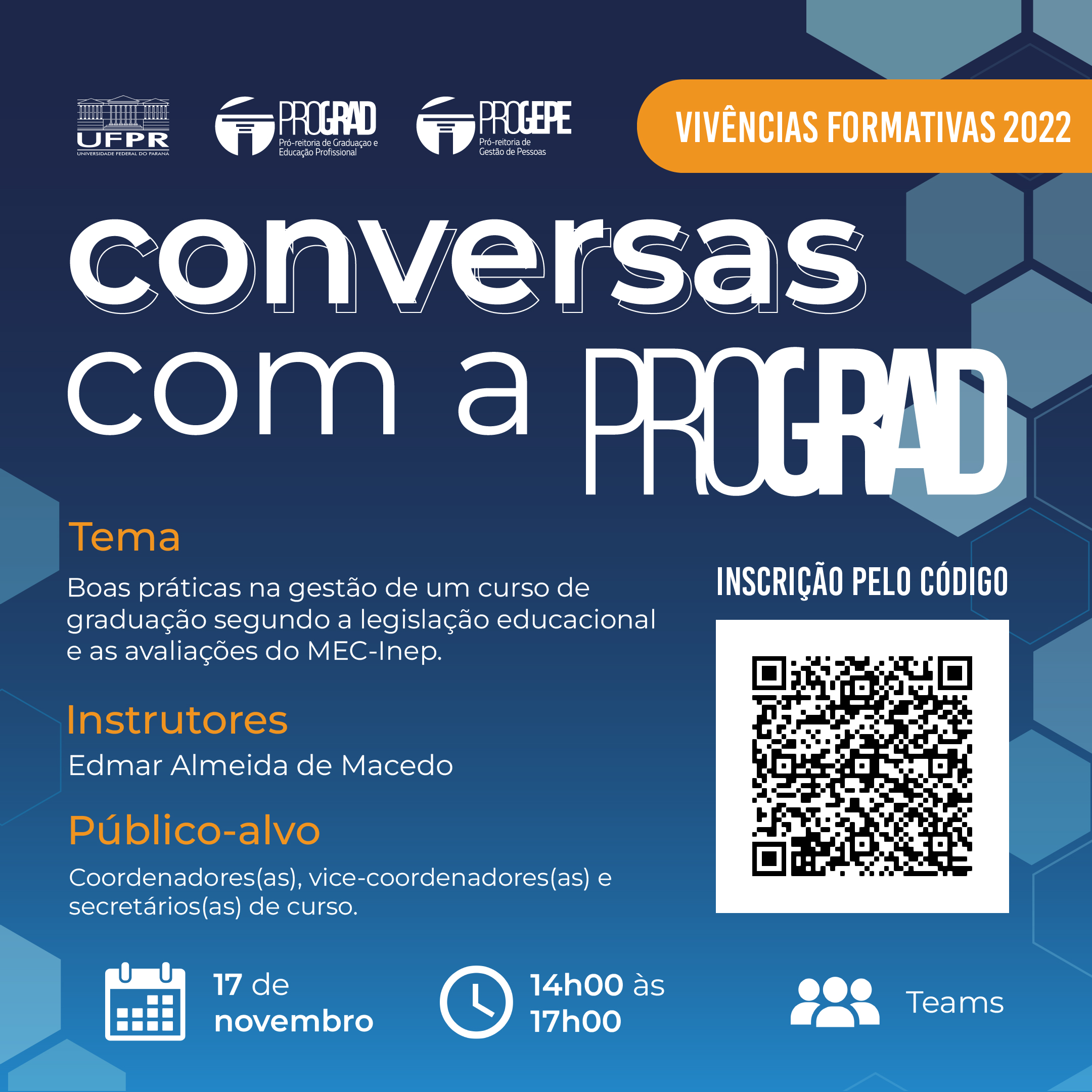 A PROGRAD (Pró-Reitoria de Graduação e Educação Profissional) da UFPR (Universidade Federal do Paraná) vai promover mais uma rodada do “Conversas com a PROGRAD”, dessa vez abordando o tema “Boas práticas na gestão de um curso de graduação segundo a legislação educacional e as avaliações do MEC-Inep.”. O evento é totalmente gratuito e vai acontecer via Microsoft Teams no dia 17 de novembro de 2022,  das 14h às 17h.