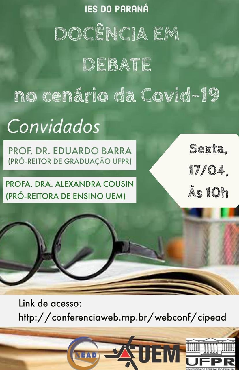 O debate ocorrerá nesta sexta-feira (17) às 10 horas, e conta com a participação do Pró-Reitor de Graduação e Educação Profissional da UFPR, Prof. Dr. Eduardo Barra, e a Pró-Reitora de Ensino da UEM, Profª Dra. Alexandra Cousin, e poderá ser acessado pelo link: http://conferecenciaweb.rnp.br/webconf/cipead .