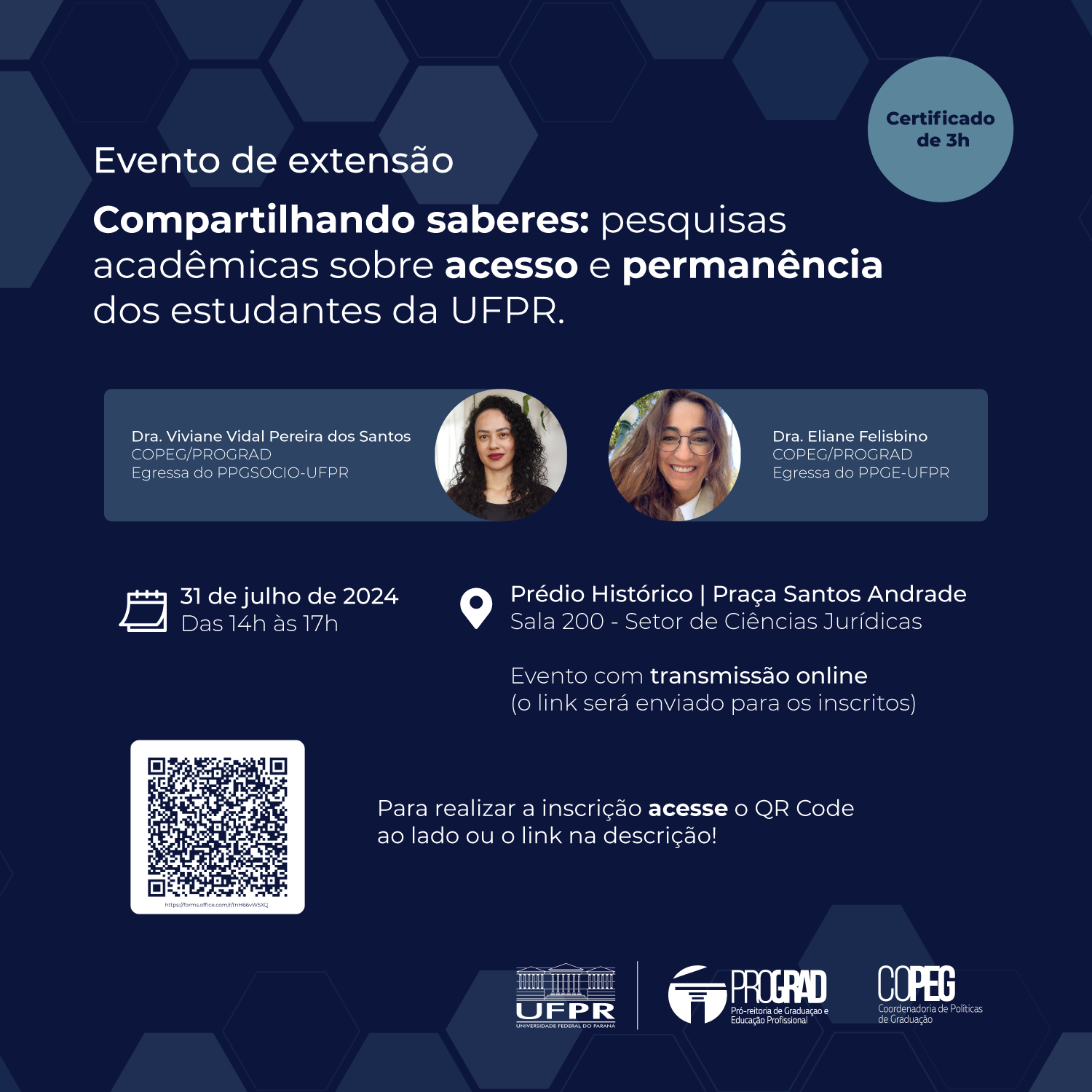 A Prograd promove na próxima quarta-feira (31), o evento de extensão “Compartilhando Saberes: pesquisas acadêmicas sobre acesso e permanência dos estudantes da UFPR”. Neste evento, as servidoras técnico administrativas da Coordenação de Políticas de Graduação (COPEG/PROGRAD) apresentam suas pesquisas acadêmicas de doutorado dedicadas ao entendimento do acesso e da permanência dos estudantes nos cursos de graduação da UFPR. Além de compartilhar os resultados encontrados, esta iniciativa visa fomentar discussões acerca dos desafios da inclusão educacional das diversas trajetórias acadêmicas dos alunos e do aprimoramento do ensino de graduação.