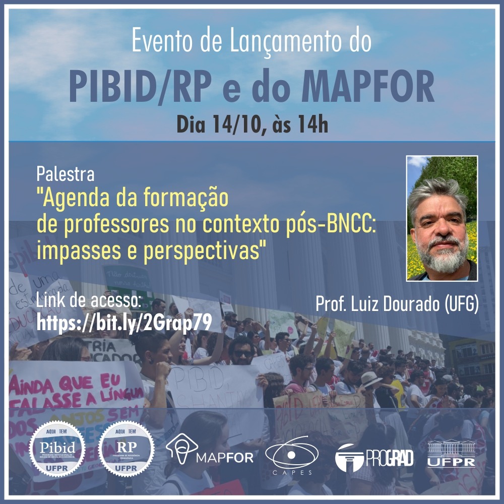 A “Agenda da Formação de Professores no Contexto Pós-BNCC: Impasses e Perspectivas” será tema do lançamento do Programa Institucional de Bolsas de Iniciação à Docência (Pibid), do Programa de Residência Pedagógica (PRP) e do Mapeamento da Formação de Professores no Estado do Paraná (MapFOR) que será realizado dia 14 de outubro.