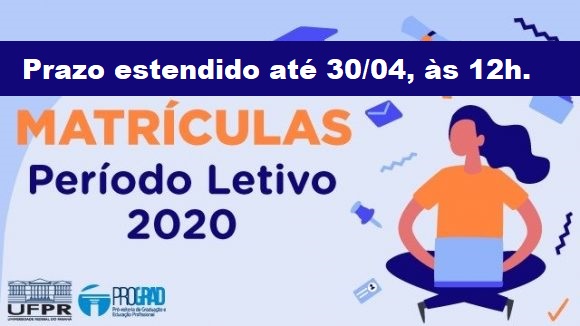 Matrículas: prazo estendido até às 12 horas do dia 30/04 por Assessoria de Comunicação da PROGRAD/UFPR — publicado 29/04/2021, 11h58, atualizado 29/04/2021, 12h02 A Prograd comunica que o prazo para solicitação de matrícula, pelos alunos, foi estendia até dia 30 de abril (sexta-feira), às 12 horas.
