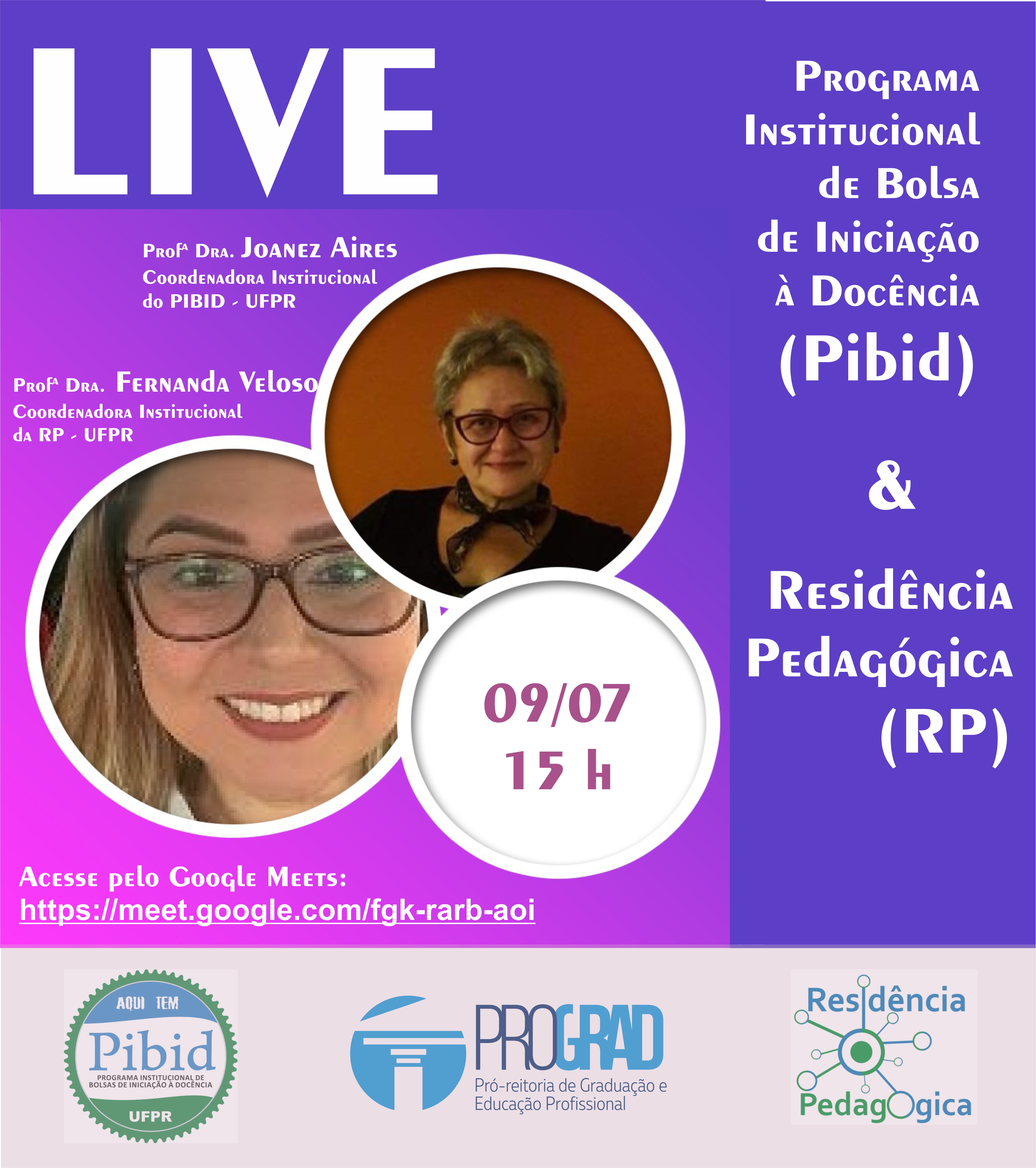Na próxima quinta-feira, dia 09 de julho, a COAFE/PROGRAD realizará uma live com as coordenadoras institucionais dos Programas de Bolsas de Iniciação à Docência (PIBID) e Residência Pedagógica (RP), Profª Dra. Joanez Aires e Profª Dra. Fernanda Veloso, respectivamente.