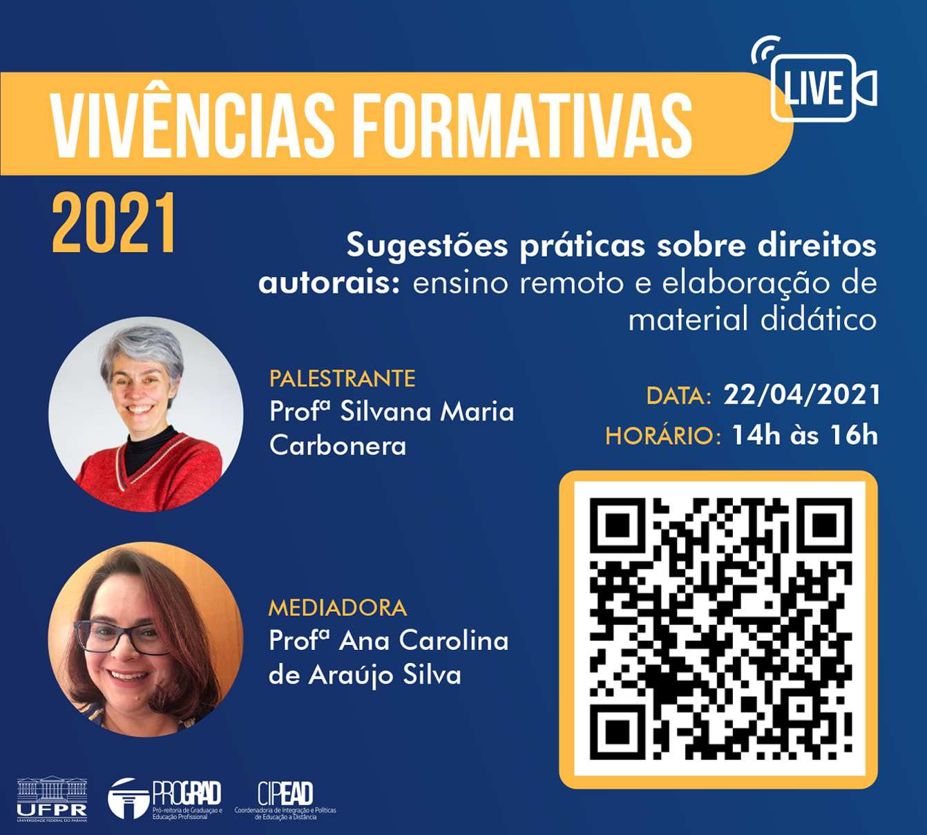 Começa nesta quinta-feira, dia 22 de abril, a programação 2021 do projeto de qualificação “Vivências Formativas para Educação Híbrida”. O projeto é fruto de uma parceria entre a PROGRAD (Pró-Reitoria de Graduação e Educação Profissional), por meio da CIPEAD (Coordenadoria de Integração de Políticas de Educação a Distância), com a PROGEPE (Pró-Reitoria de Gestão de Pessoas) da UFPR.