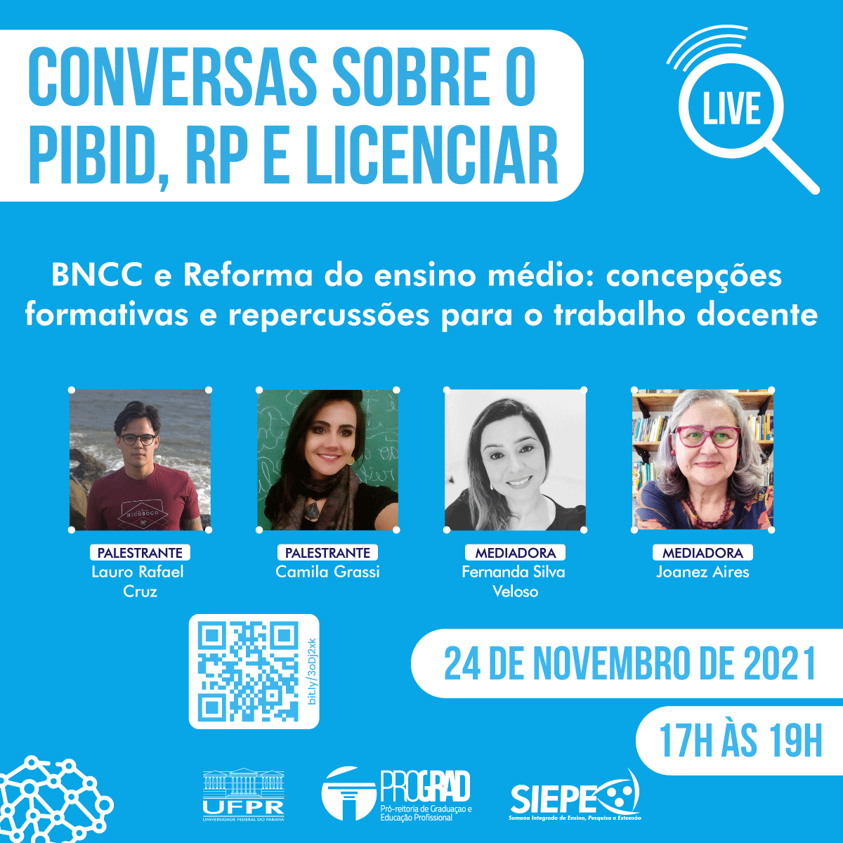 No dia seguinte, quarta-feira (24), também às 17h, os palestrantes Lauro Rafael Cruz e Camila Grassi darão continuidade à programação com a live “Conversas sobre o PIBID, RP e Licenciar”, debatendo o tema “BNCC  e Reforma do ensino médio: concepções formativas e repercussões para o trabalho docente”. A transmissão também acontecerá pelo canal da PROGRAD UFPR no YouTube.