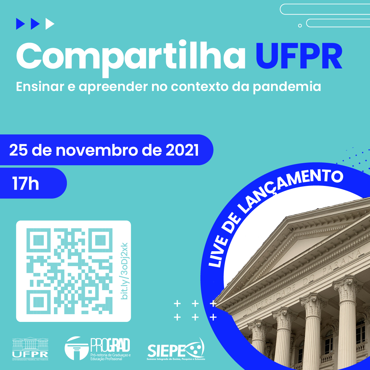 Por fim, quinta-feira (25), assim como as demais, às 17h, acontece a live de lançamento do “Compartilha UFPR”, que tem o objetivo de divulgar resultados de pesquisas, relatos de experiências e memórias sobre o ensino de graduação em tempos de pandemia. A live marca o lançamento do site do Compartilha, promovendo um bate papo entre autores e divulgando os trabalhos selecionados pelo programa. O live de lançamento também será pelo canal da PROGRAD UFPR no YouTube.