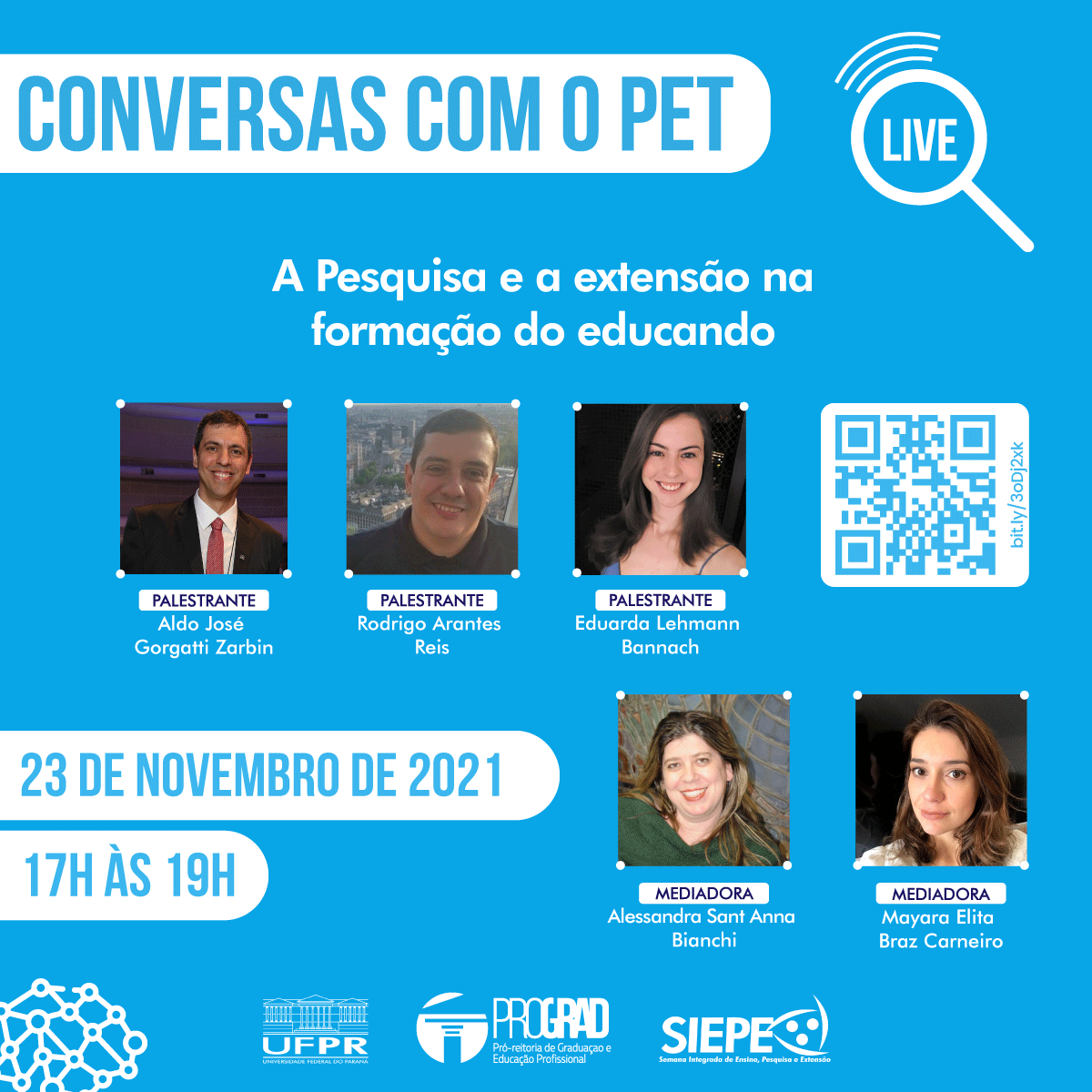 A primeira live, do “Conversas com o PET”, tem como tema “A Pesquisa e a extensão na formação do educando” e vai marcar o início da programação na próxima terça-feira (23), às 17h. A transmissão contará com a participação dos palestrantes Aldo José Gorgatti Zarbin, Rodrigo Arantes Rei e Eduarda Lehmann Bannach. A discussão será transmitida pelo canal da PROGRAD UFPR no YouTube.