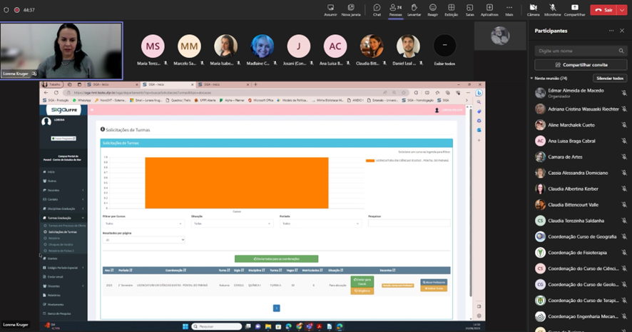 O curso teve mais de 100 inscritos e foi realizado online. Coordenadores de curso, chefes de departamentos, secretários de cursos e de departamentos, além de servidores da própria Prograd foram a maioria dos participantes. A instrutora, Lorena Kruger, servidora da Prograd e uma das colaboradoras da implantação do SIGA, comandou o treinamento com espaço para perguntas dos participantes e sugestões de melhoria no sistema.