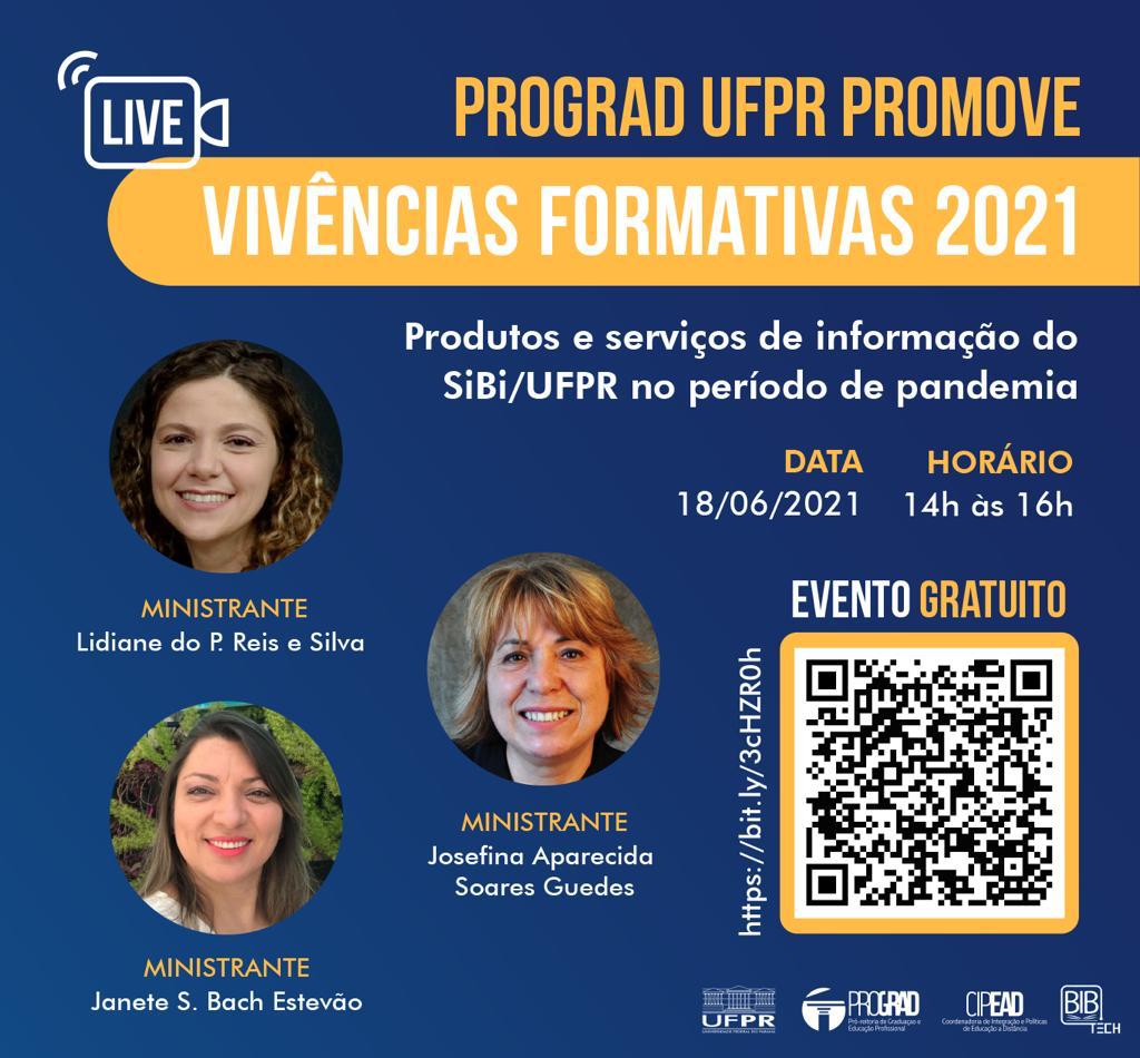 A quinta live das Vivências em 2021 será promovida pelo SiBi, Sistema de Bibliotecas da UFPR, que oferece por meio de seu NTE SibiTech a live “Produtos e serviços de informação do Sibi/UFPR no período de pandemia”. A atividade acontecerá no dia 18 de junho (sexta-feira), com início previsto para às 14h e carga horária de 2 horas. Toda a comunidade acadêmica pode participar por meio da UFPR Aberta ou no canal da Cipead no YouTube.