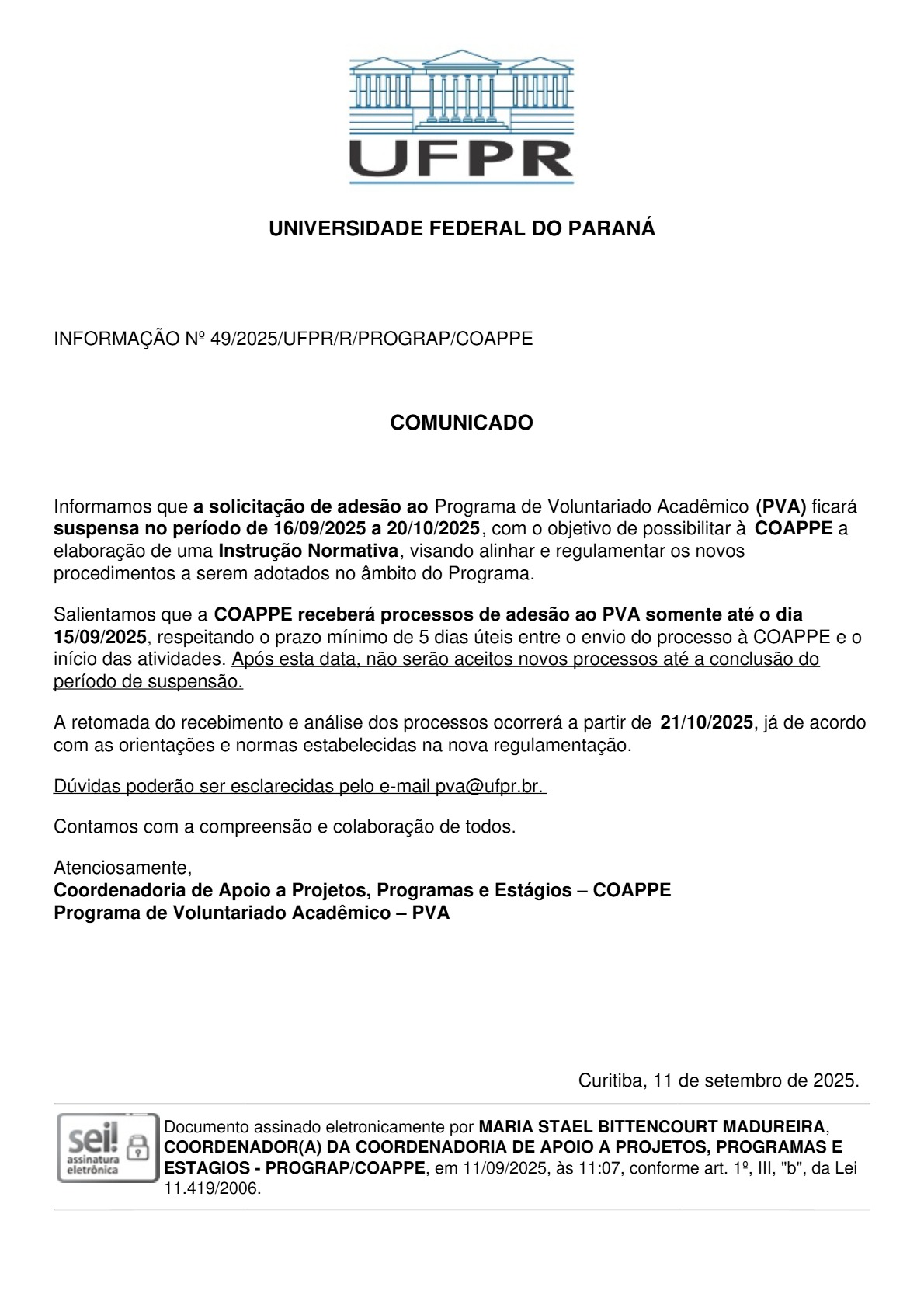 A PROGRAP informa à comunidade acadêmica que o recebimento de solicitações de adesão ao Programa de Voluntariado Acadêmico (PVA) será temporariamente suspenso no período de 16/09/2025 a 20/10/2025. A medida tem como finalidade permitir à COAPPE a elaboração de uma Instrução Normativa que alinhará e regulamentará novos procedimentos do Programa.
