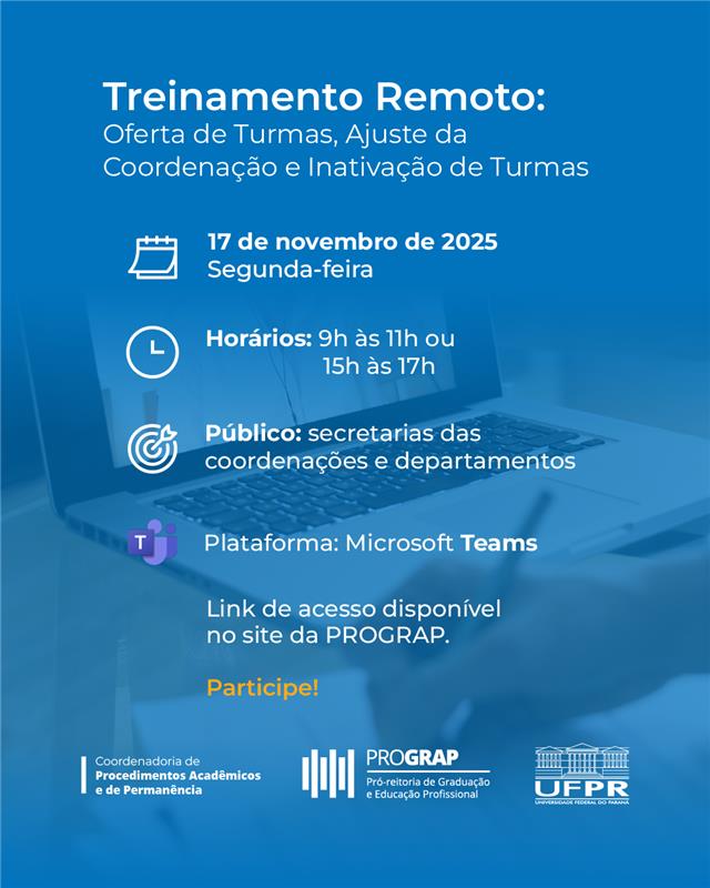A Pró-Reitoria de Graduação e Educação Profissional (PROGRAP/UFPR), por meio da Coordenação de Procedimentos Acadêmicos e Permanência (COPAP), realizará o treinamento remoto “Oferta de Turmas, Ajuste da Coordenação e Inativação de Turmas”.