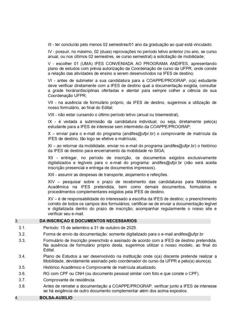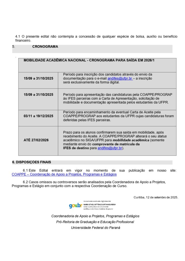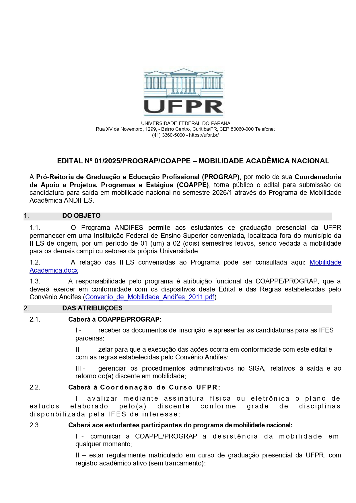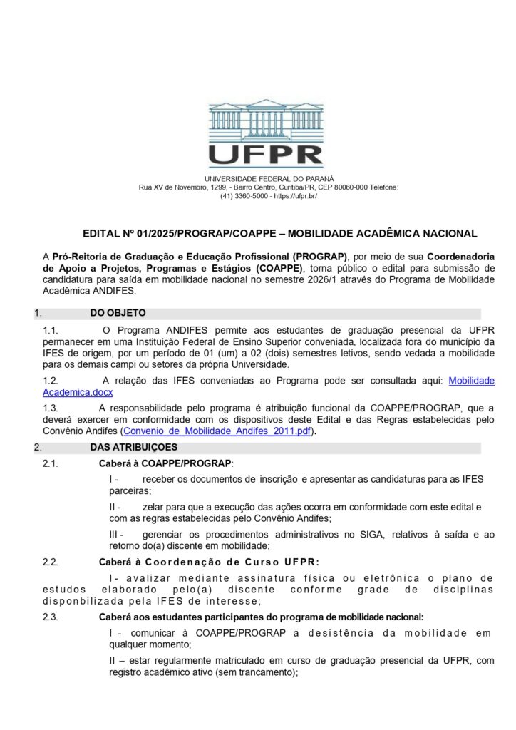 A Pró-Reitoria de Graduação e Educação Profissional (PROGRAP), por meio da Coordenadoria de Apoio a Projetos, Programas e Estágios (COAPPE), torna público o Edital nº 01/2025/PROGRAP/COAPPE – Mobilidade Acadêmica Nacional, referente à submissão de candidaturas para saída em mobilidade no semestre 2026/1, no âmbito do Programa de Mobilidade Acadêmica ANDIFES.