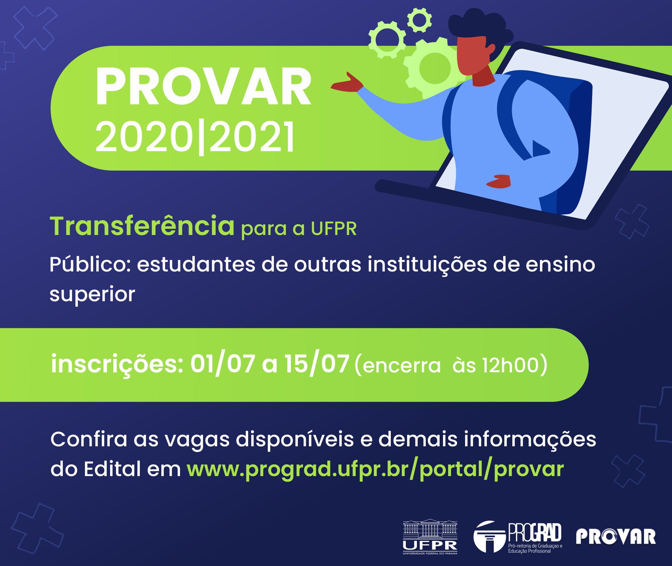 Estão abertas as inscrições para a modalidade de transferência do Processo de Ocupação de Vagas Remanescentes – PROVAR. Nessa modalidade, podem participar alunos de outras instituições de ensino superior nacional ou estrangeira, que desejam transferência para a UFPR, desde que o curso de origem seja identificado como curso afim pela coordenação do curso desejado.