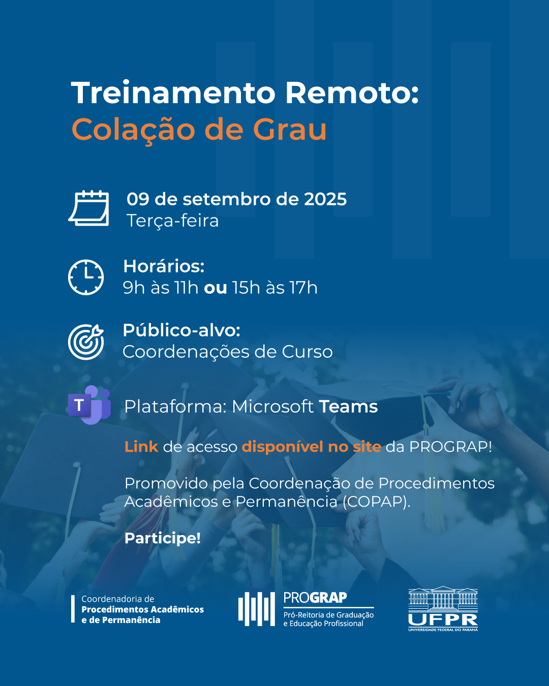 A Pró-Reitoria de Graduação e Educação Profissional (PROGRAP/UFPR), por meio da Coordenação de Procedimentos Acadêmicos e Permanência (COPAP), promoverá no dia 09 de setembro de 2025 (terça-feira) um treinamento remoto sobre Colação de Grau, direcionado às coordenações de curso da UFPR.