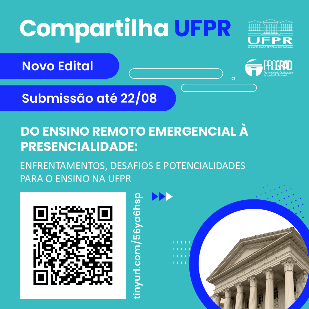 A UFPR (Universidade Federal do Paraná), por meio da PROGRAD (Pró-Reitoria de Graduação e Educação Profissional), torna públicas as normas para a submissão de originais para a publicação “Compartilha UFPR: desafios e possibilidades do ensino na UFPR”.